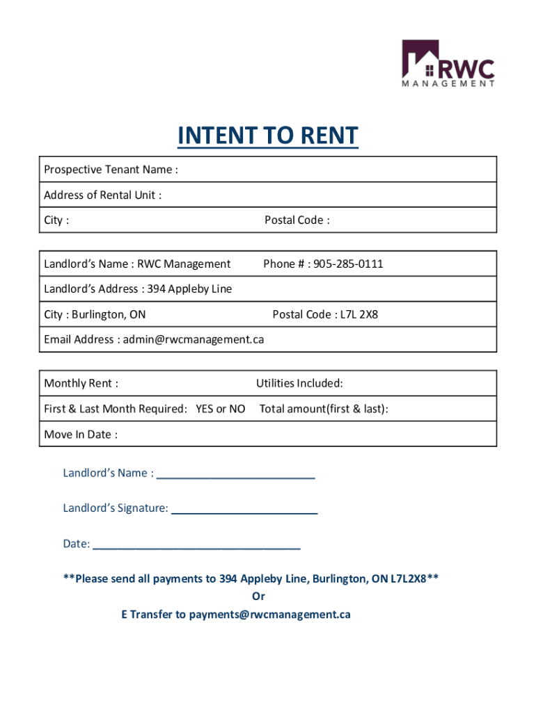INTENT TO RENT Prospective Tenant Name : Address of Rental Unit : City :Postal Code :Landlords Name : ROC ManagementPhone # : 9052850111Landlords Address : 394 Appleby Line City : Burlington, Postal