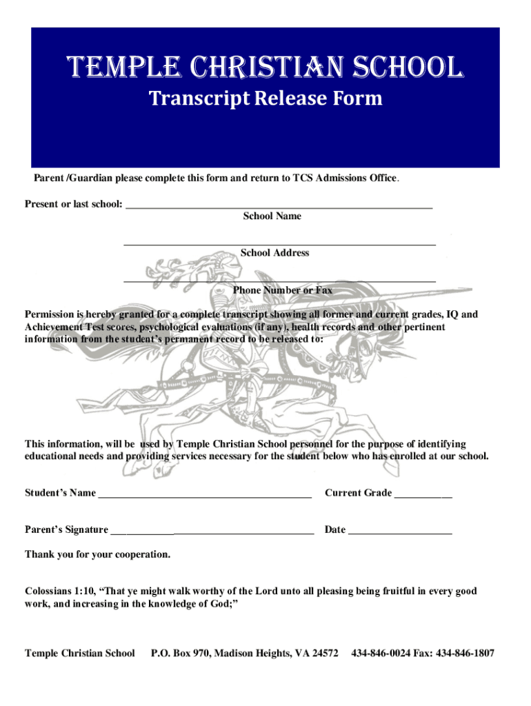 TEMPLE CHRISTIAN SCHOOL Transcript Release Forepart /Guardian please complete this form and return to TCS Admissions Office. Present or last school: ___ School Name ___ School Address ___ Phone Number