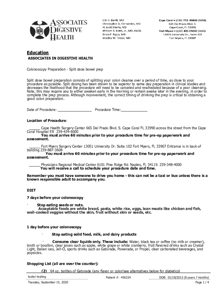 Education ASSOCIATES IN DIGESTIVE HEALTH ColonoscopyPreparationSplitdosebowelprep Splitdosebowelpreparationconsistsofsplittingyourcoloncleanseoveraperiodoftime, asclosetoyour procedureaspossible.