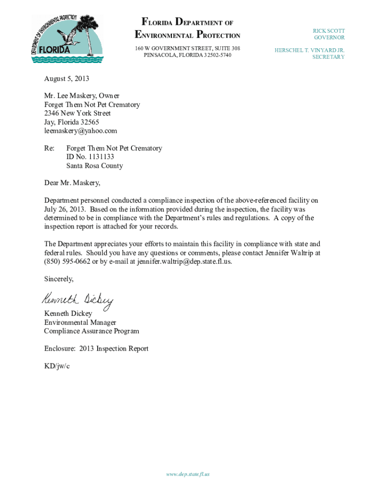 FLORIDA DEPARTMENT OF ENVIRONMENTAL PROTECTIONISM SCOTT GOVERNOR160 W GOVERNMENT STREET, SUITE 308 PENSACOLA, FLORIDA 325025740HERSCHEL T. VINEYARD JR. SECRETARY August 5, 2013, Mr. Lee Mastery, Owner