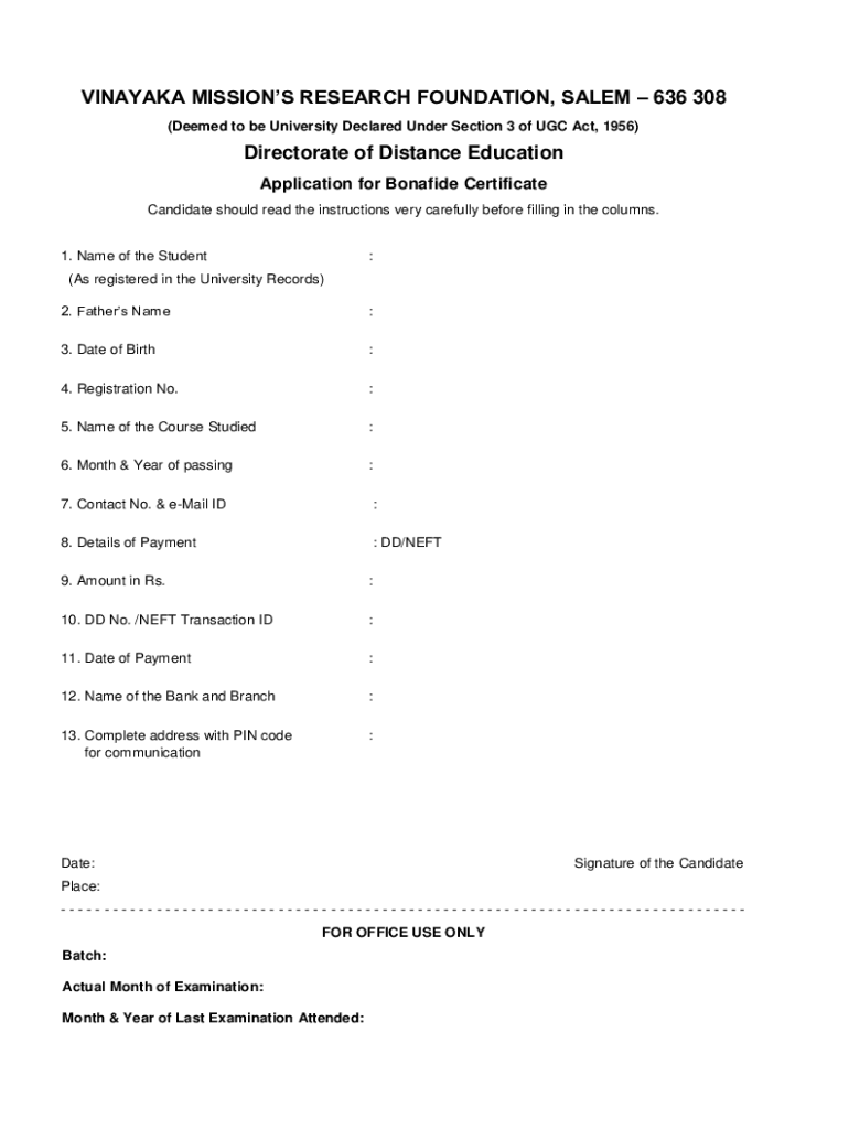 HINAYANA MISSIONS RESEARCH FOUNDATION, SALEM 636 308 (Deemed to be University Declared Under Section 3 of UGC Act, 1956)Directorate of Distance Education Application for Bona fide Certificate Candidate