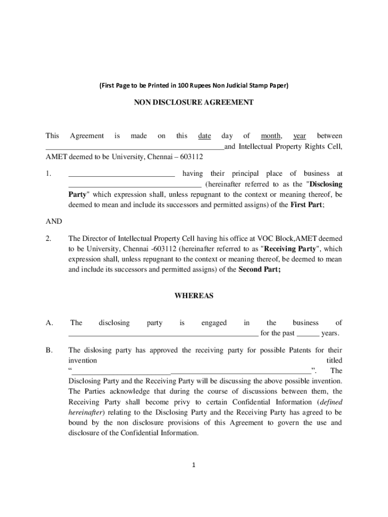 (First Page to be Printed in 100 Rupees Non-Judicial Stamp Paper)NON DISCLOSURE Agreements Agreement is made on this date day of month, year between ___and Intellectual Property Rights Cell, MET deemed