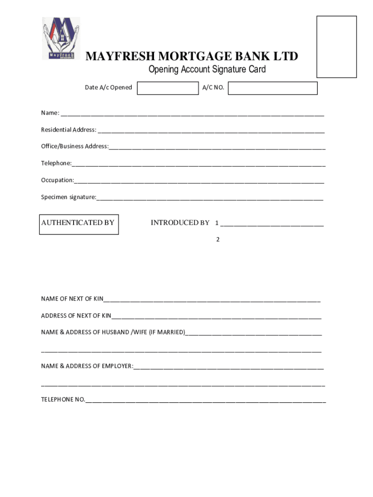 AFRESH MORTGAGE BANK LTD Opening Account Signature Candidate A/c Opened/C NO. Name: ___ Residential Address: ___ Office/Business Address:___ Telephone:___ Occupation:___ Specimen signature:___AUTHENTICATED