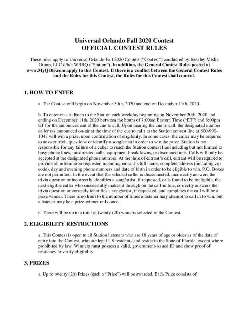Universal Orlando Fall 2020 Contest OFFICIAL CONTEST RULES These rules apply to Universal Orlando Fall 2020 Contest (Contest) conducted by Beasley Media Group, LLC d/b/a WEB (Station). In addition,