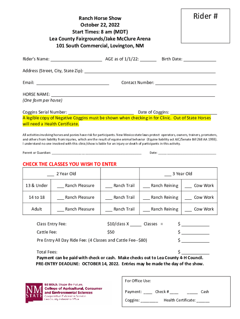 Rider #Ranch Horse Show October 22, 2023, Start Times: 8 am (MDT) Lea County Fairgrounds/Jake McClure Arena 101 South Commercial, Covington, NM Riders Name: ___ AGE as of 1/1/22: ___Birth Date: ___Address