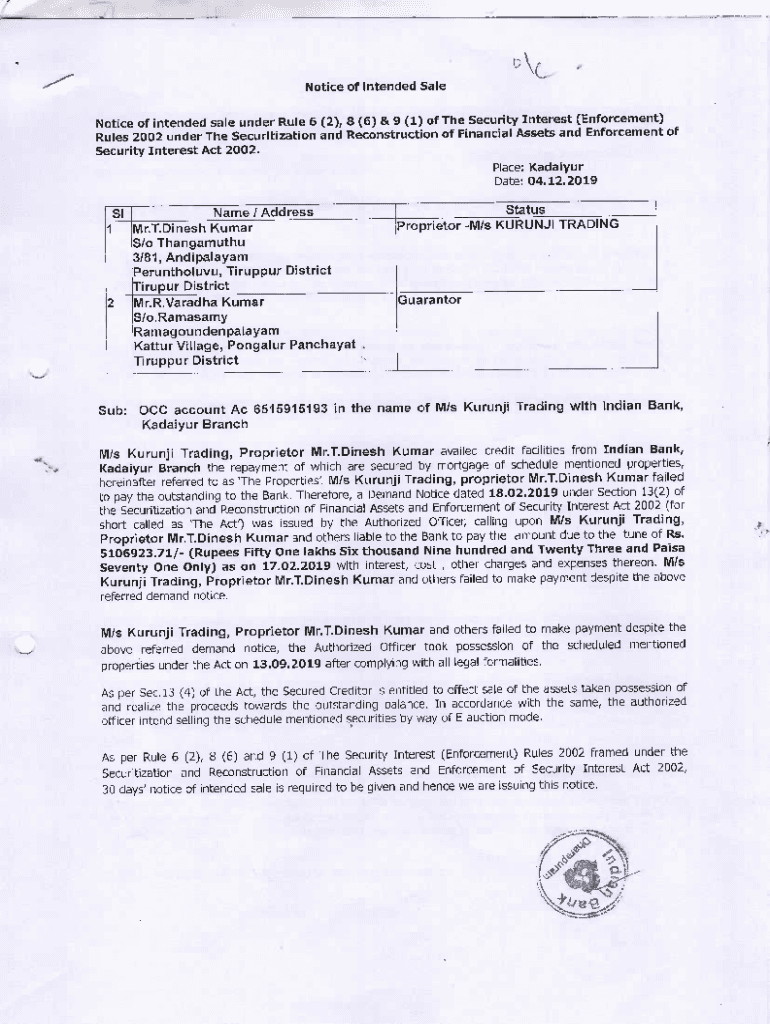 Notice of intended Valentine of intended sale under Rule 6 (2), 8 (6) & 9 (1) of The Security Interest (Enforcement)