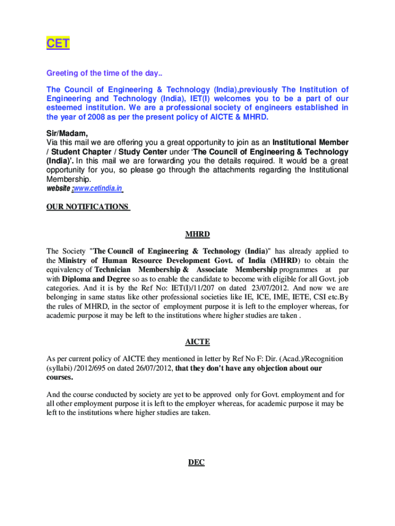 CET Greeting of the time of the day. The Council of Engineering & Technology (India), previously The Institution of Engineering and Technology (India), IT(I) welcomes you to be a part of our esteemed
