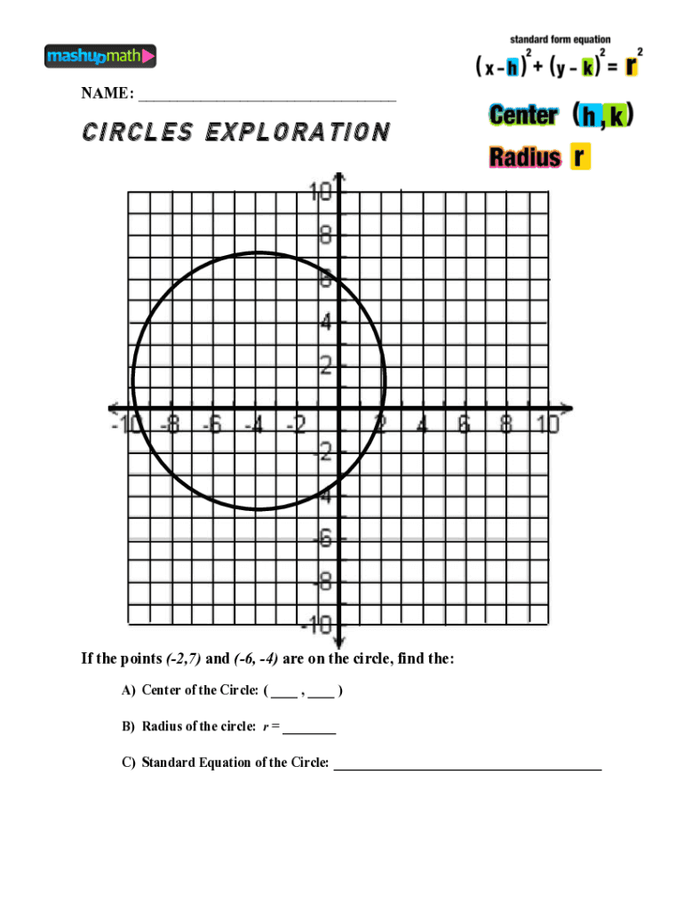 1NAME: ___CIRCLES Exploration the points (2,7) and (6, 4) are on the circle, find the: A) Center of the Circle: (___, ___) B) Radius of the circle: r ___ C) Standard Equation of the Circle: ___2Write