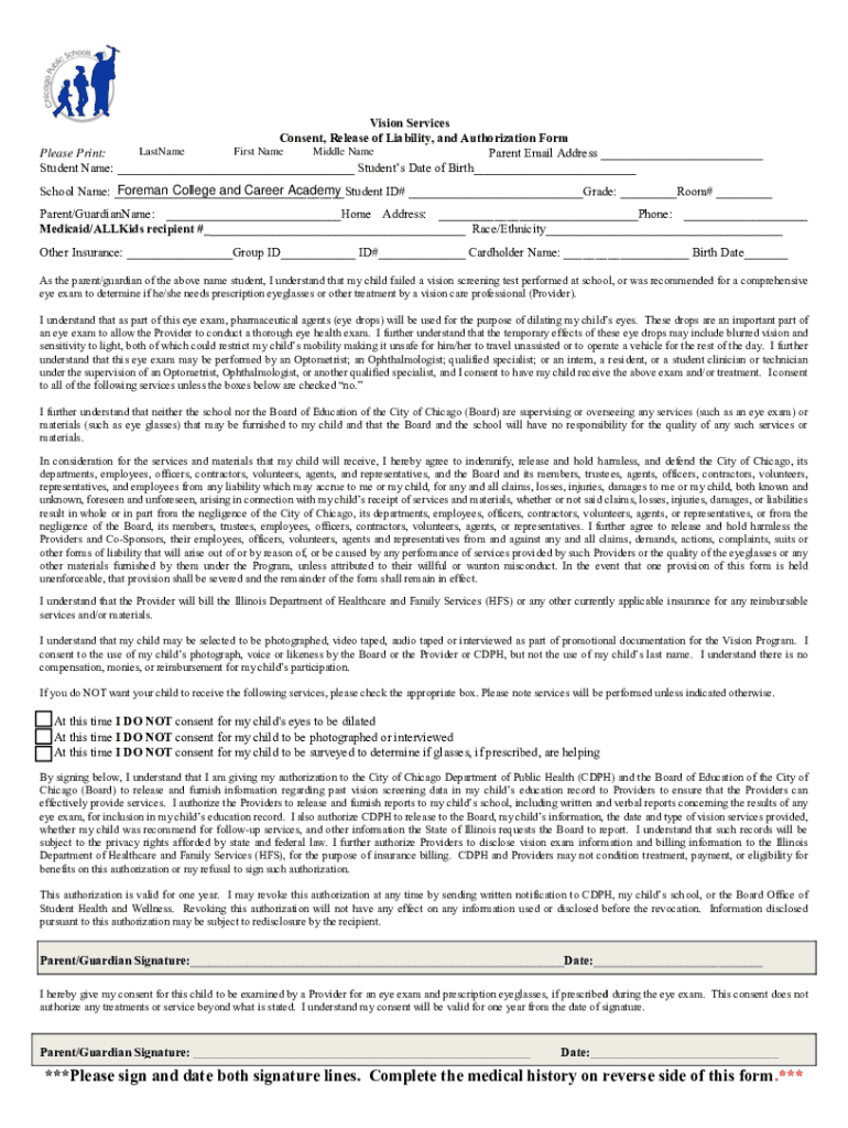 Vision Services Consent, Release of Liability, and Authorization Form Hostname First Name Middle Name Please Print: Parent Email Address ___ Student Name: ___ Students Date of Birth___Foreman College