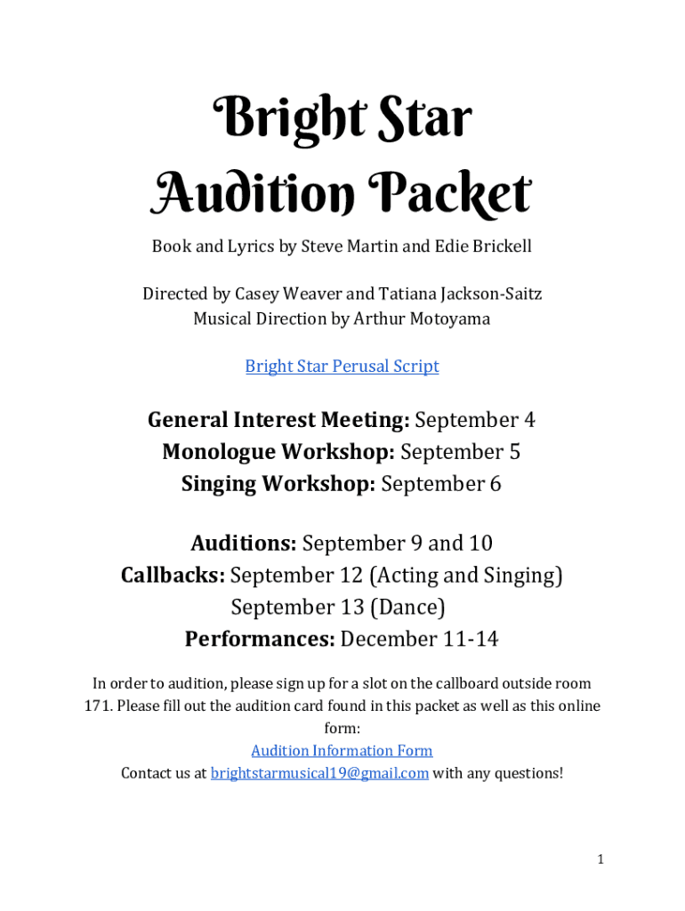 Anyone interested in auditioning for the Bright Star musical is required to file the audition packet.