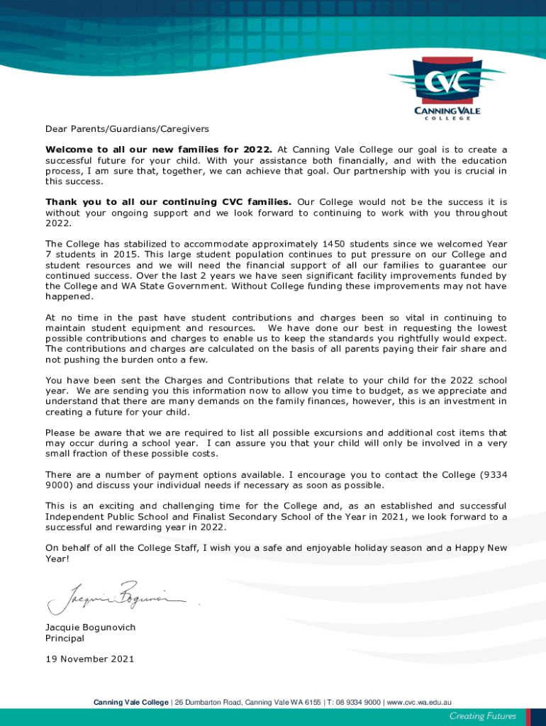 Dear Parents/Guardians/Caregivers Welcome to all our new families for 2022. At Canning Vale College our goal is to create a successful future for your child. With your assistance both financially,