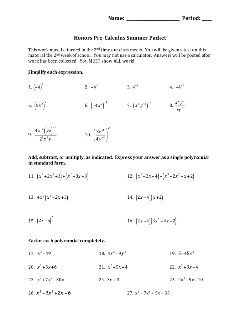 Name:___Period: ___Honors PreCalculus Summer Packets work must be turned in the 2nd time our class meets. You will be given a test on this material the 2nd week of school. You may not use a calculator.