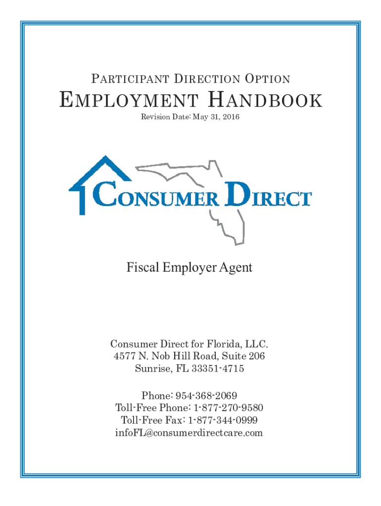 P PARTICIPANT D DIRECTION O PTI ONE EMPLOYMENT H HANDBOOK Revision Date: May 31, 2016, Fiscal Employer Agent Consumer Direct for Florida, LLC. 4577 N. Nob Hill Road, Suite 206 Sunrise, FL 333514715Phone: