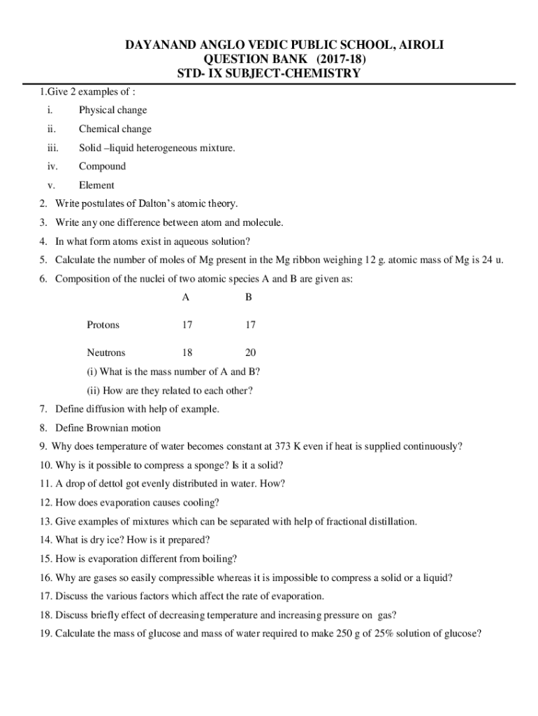 DAYANA ANGLO VEDIC PUBLIC SCHOOL, AIOLI QUESTION BANK (201718) STD IX SUBJECTCHEMISTRY 1. Give 2 examples of : i. Physical change ii. Chemical change iii. Solid liquid heterogeneous mixture.iv. Compound.