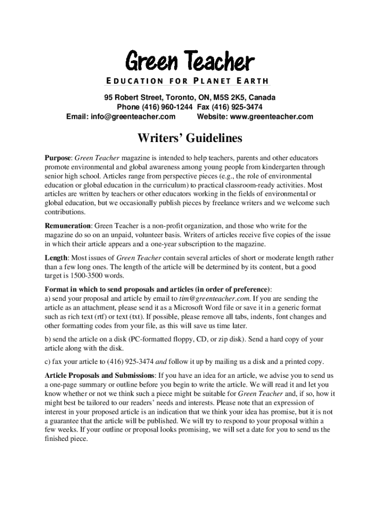 EDUCATION FOR PLANET EARTH 95 Robert Street, Toronto, ON, M5S 2K5, Canada Phone (416) 9601244 Fax (416) 9253474 Email: info@greenteacher.com Website: www.greenteacher.comWriters Guidelines Purpose: