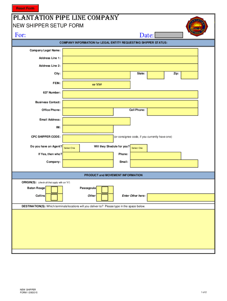 Reset Implantation PIPE LINE COMPANY NEW SHIPPER SETUP Former:Date: COMPANY INFORMATION for LEGAL ENTITY REQUESTING SHIPPER STATUS: Company Legal Name: Address Line 1: Address Line 2: City:State:VEIN:Zip:or