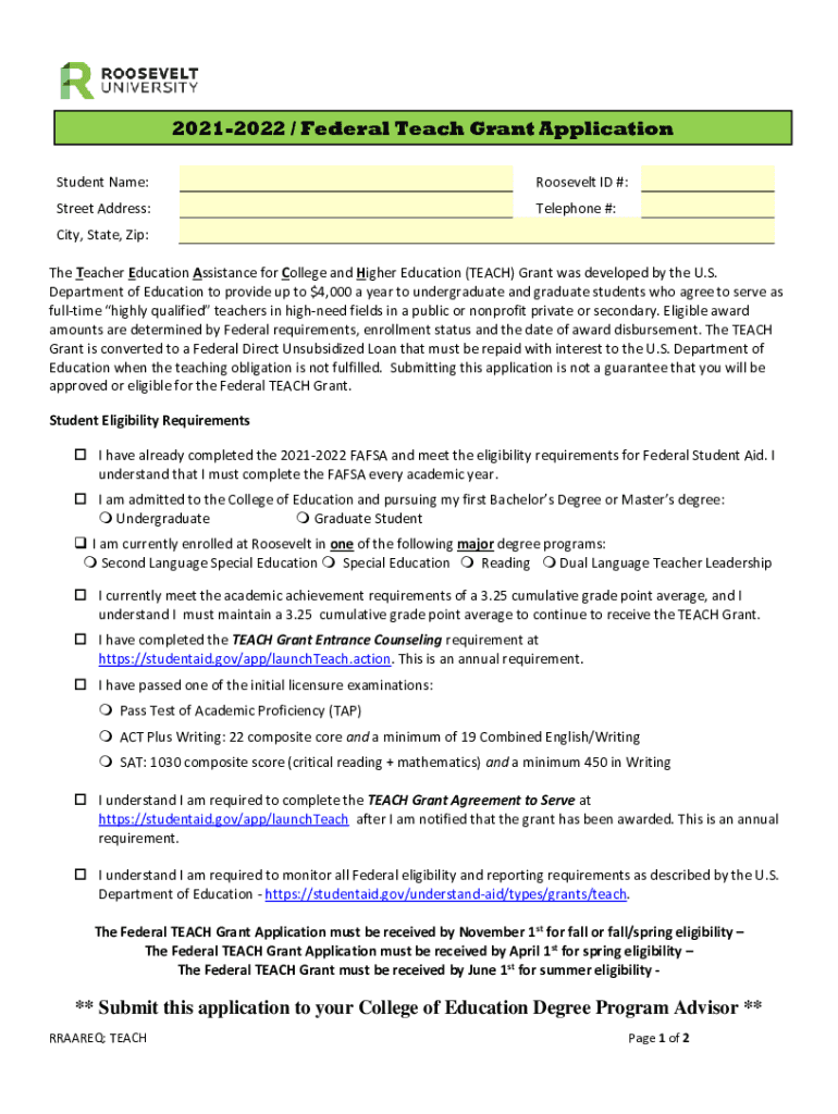 20212022 / Federal Teach Grant Application Student Name:Roosevelt ID #:Street Address:Telephone #:City, State, Zip: The Teacher Education Assistance for College and Higher Education (TEACH) Grant