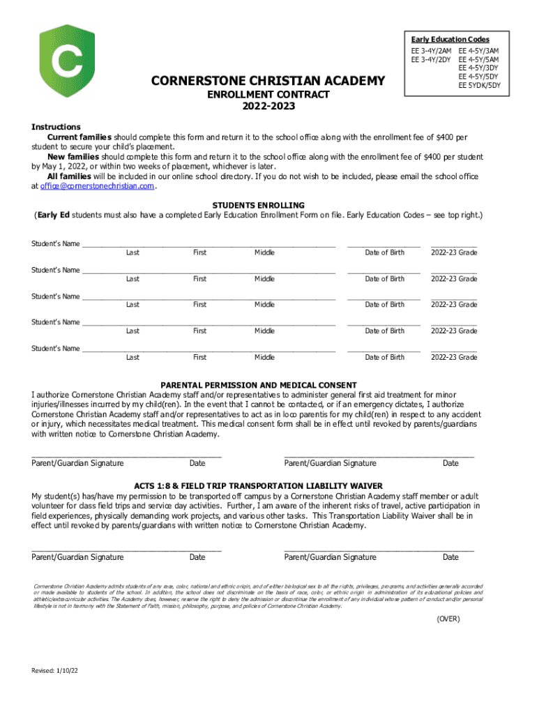 Early Education CodesCORNERSTONE CHRISTIAN ACADEMY ENROLLMENT CONTRACT 20222023EE 34Y/2AM EE 34Y/2DY EE EE EE EE45Y/3AM 45Y/5AM 45Y/3DY 45Y/5DY 5YDK/5DYInstructions Current families should complete