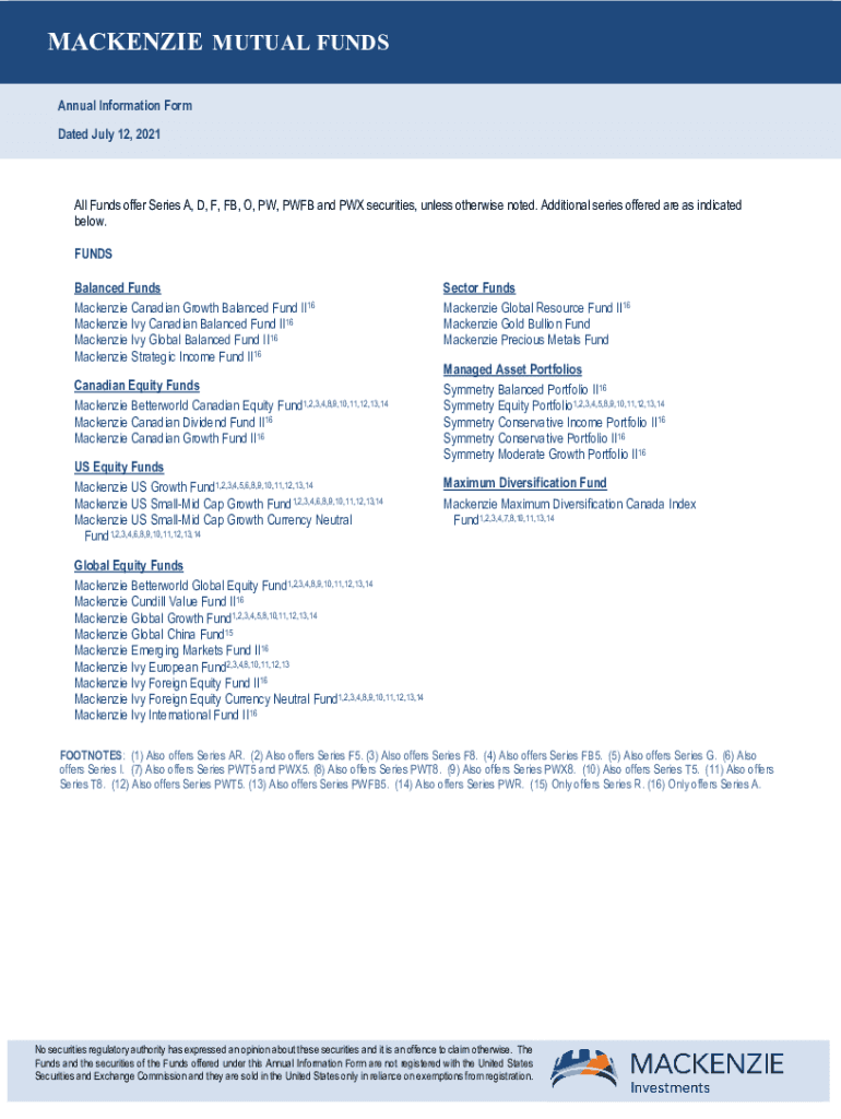 MACKENZIE MUTUAL FUNDS Annual Information Form Dated July 12, 2021All Funds offer Series A, D, F, FB, O, PW, PWB and PBX securities, unless otherwise noted. Additional series offered are as indicated