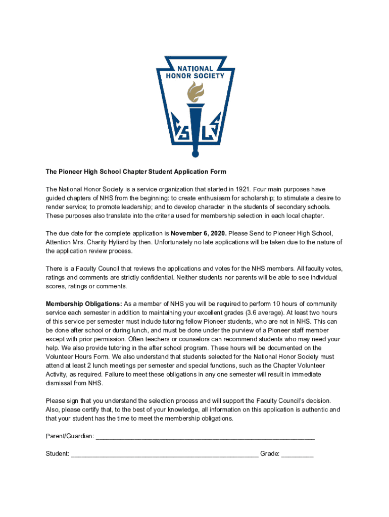 The Pioneer High School Chapter Student Application Form The National Honor Society is a service organization that started in 1921. Four main purposes have guided chapters of NHS from the beginning: