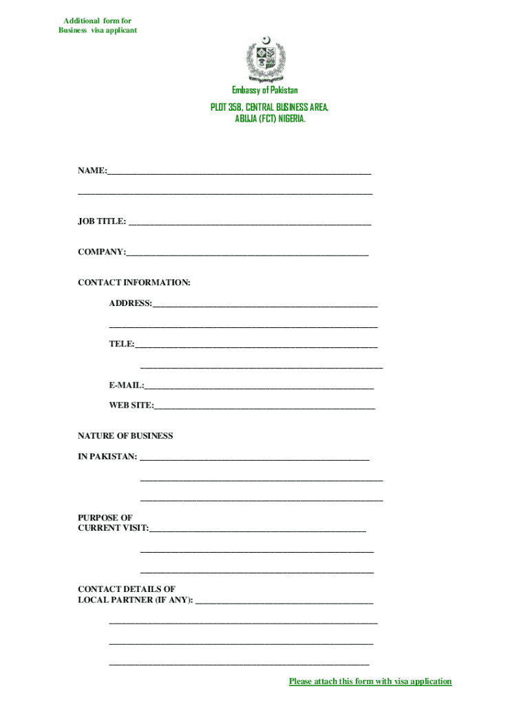 Additional form for Business visa applicantEmbassy of Pakistan PLOT 358, CENTRAL BUSINESS AREA, ABUJA (ACT) NIGERIA.NAME:___ ___JOB TITLE: ___COMPANY:___CONTACT INFORMATION: ADDRESS:___ ___ TELL:___