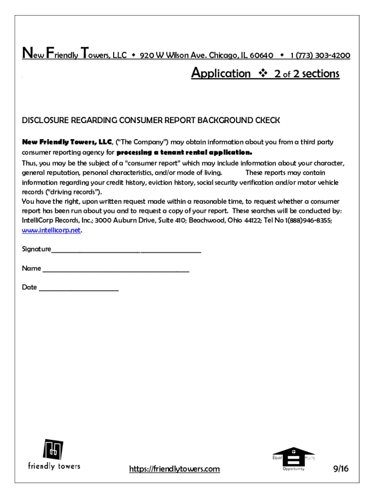 New Friendly Towers, LLC 920 W Wilson Ave. Chicago, IL 60640 1 (773) 3034200Application 2 of 2 sections. DISCLOSURE REGARDING CONSUMER REPORT BACKGROUND CHECK New Friendly Towers, LLC, (The Company)