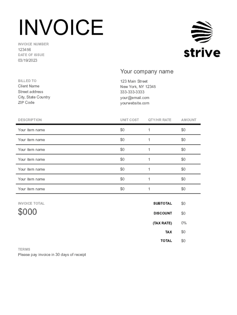 INVOICE NUMBER123456 DATE OF ISSUE03/19/2023Your company name BILLED Client Name Street address City, State Country ZIP Code123 Main Street New York, NY 12345 3333333333 your@email.com your website.comDESCRIPTIONUNIT