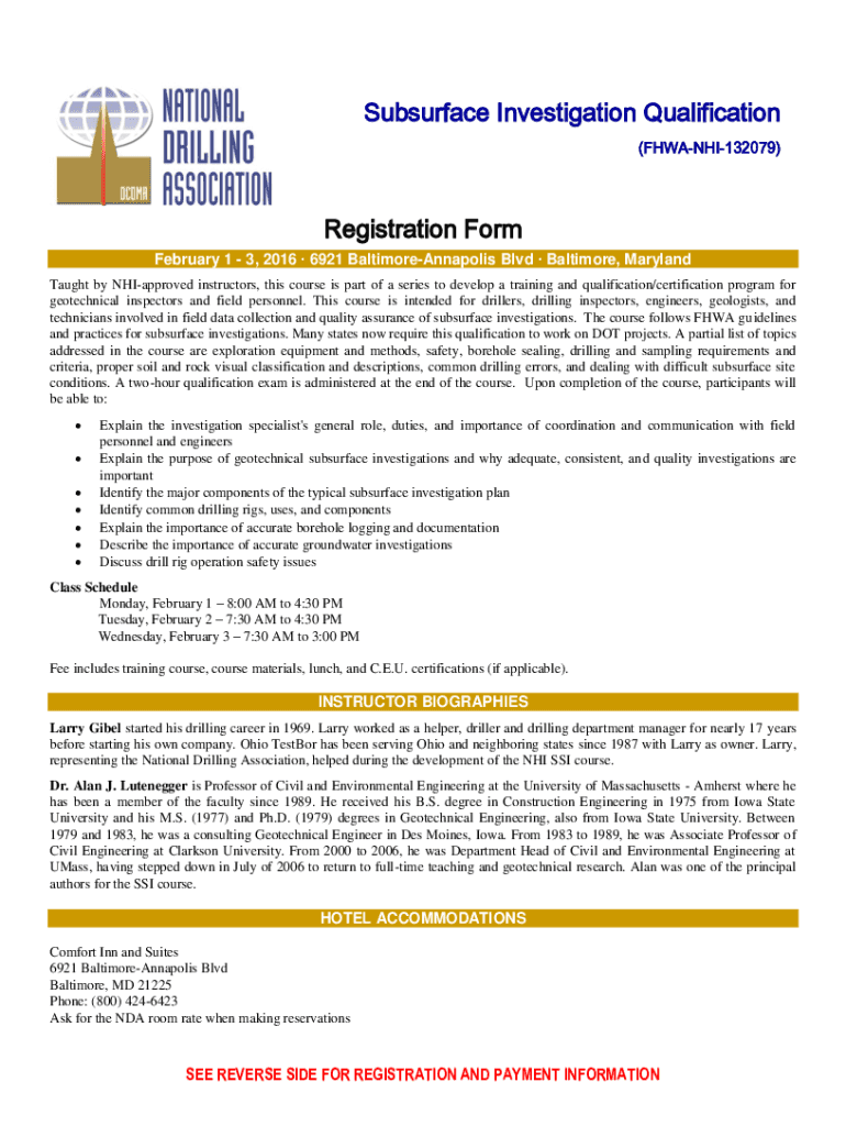 Subsurface Investigation Qualification (FHWANHI132079)Registration Form February 1 3, 2016 6921 Baltimore Annapolis Blvd Baltimore, Maryland Taught by Approved instructors, this course is part of
