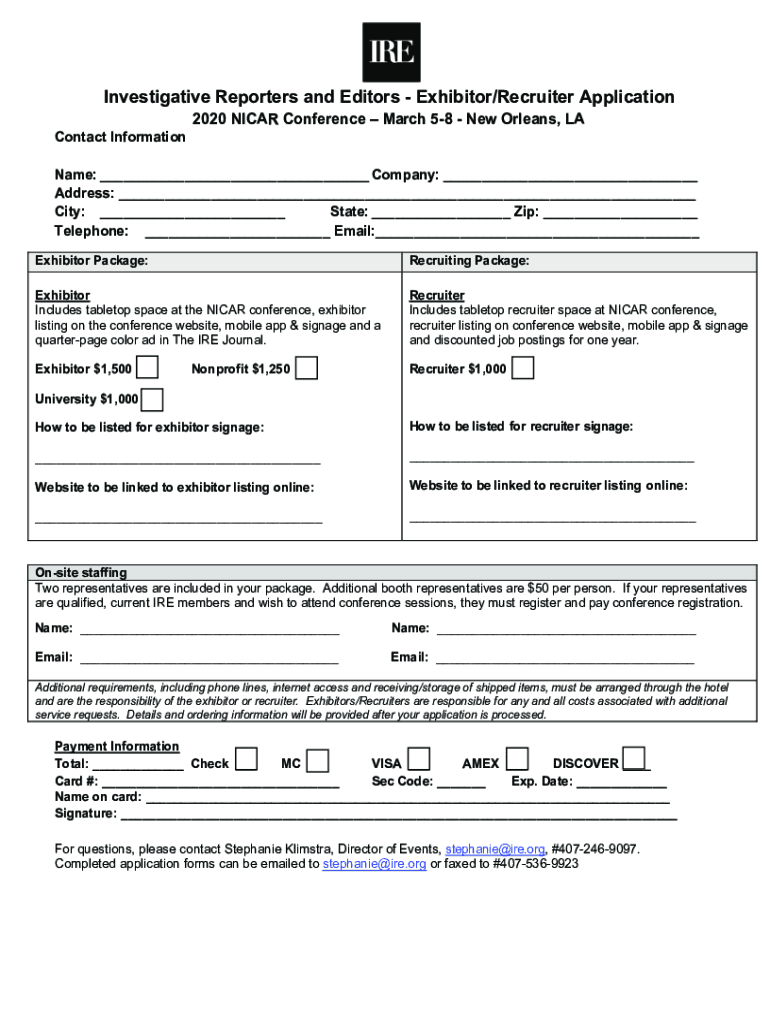 Investigative Reporters and Editors Exhibitor/Recruiter Application 2020 VICAR Conference March 58 New Orleans, LA Contact Information Name: ___ Company: ___ Address: ___ City: ___ State: ___ Zip: