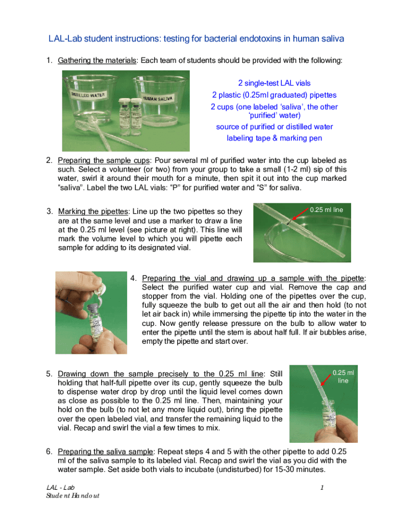 Valley student instructions: testing for bacterial endotoxins in human saliva 1. Gathering the materials: Each team of students should be provided with the following: 2 single test LAW vials 2 plastic