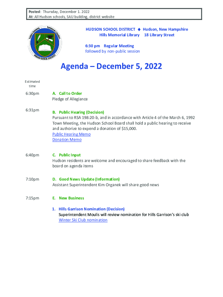 At:AllHudsonschools, SAU building, districtwebsiteHUDSONSCHOOLDISTRICT Hudson, New Hampshire
