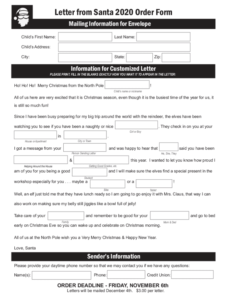 Letter from Santa 2020 Order Form Mailing Information for Envelope Child's First Name:Last Name:Child's Address: City:State:Zip:Information for Customized Letter PLEASE PRINT. FILL IN THE BLANKS EXACTLY