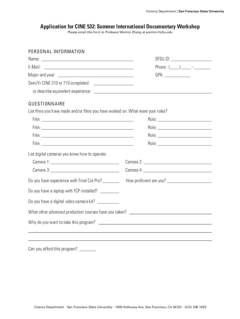 Cinema Department | San Francisco State UniversityApplication for CINE 532: Summer International Documentary Workshop Please email this form to Professor Gamin Zhang at weimin@sfsu.eduPERSONAL INFORMATION