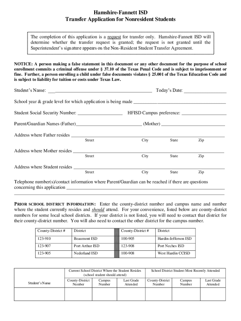 HamshireFannett ISD Transfer Application for Nonresident Students The completion of this application is a request for transfer only. HamshireFannett ISD will determine whether the transfer request