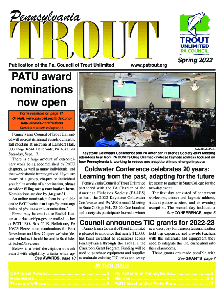 Publication of the Pa. Council of Trout Unlimited. Pa trout. Offspring 2022PATU award nominations now open Form available on page 11. Or visit: www.patrout.org/index.php/ patuawardsnominations Deadline