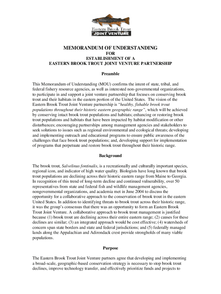 MEMORANDUM OF UNDERSTANDING FOR ESTABLISHMENT OF A EASTERN BROOK TROUT JOINT VENTURE PARTNERSHIP Preamble This Memorandum of Understanding (YOU) confirms the intent of state, tribal, and federal fishery