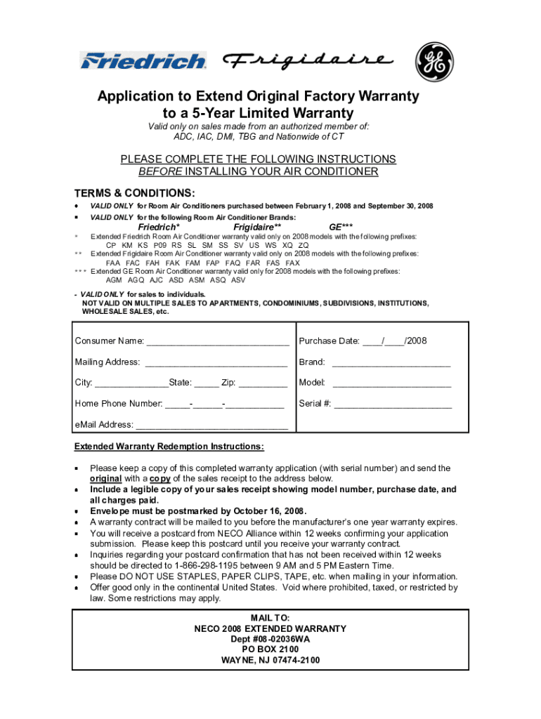 Application to Extend Original Factory Warranty to a 5Year Limited Warranty Valid only on sales made from an authorized member of: ADC, IAC, DMI, TAG and Nationwide of PLEASE COMPLETE THE FOLLOWING