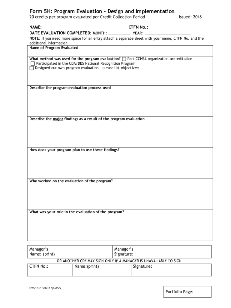 Form 5H: Program Evaluation Design and Implementation 20 credits per program evaluated per Credit Collection PeriodIssued: 2018NAME: ___ CTF No.: ___ DATE EVALUATION COMPLETED: MONTH: ___ YEAR: ___