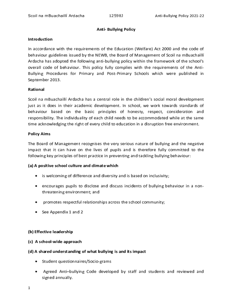 Soil Na mBuachaill Ardacha12598JAntiBullying Policy 202122Anti Bullying Policy Introduction In accordance with the requirements of the Education (Welfare) Act 2000 and the code of behavior guidelines