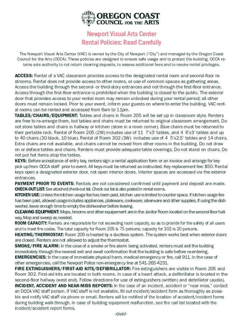 Newport Visual Arts Center Rental Policies: Read Carefully The Newport Visual Arts Center (VAC) is owned by the City of Newport (City) and managed by the Oregon Coast Council for the Arts (CCA). These