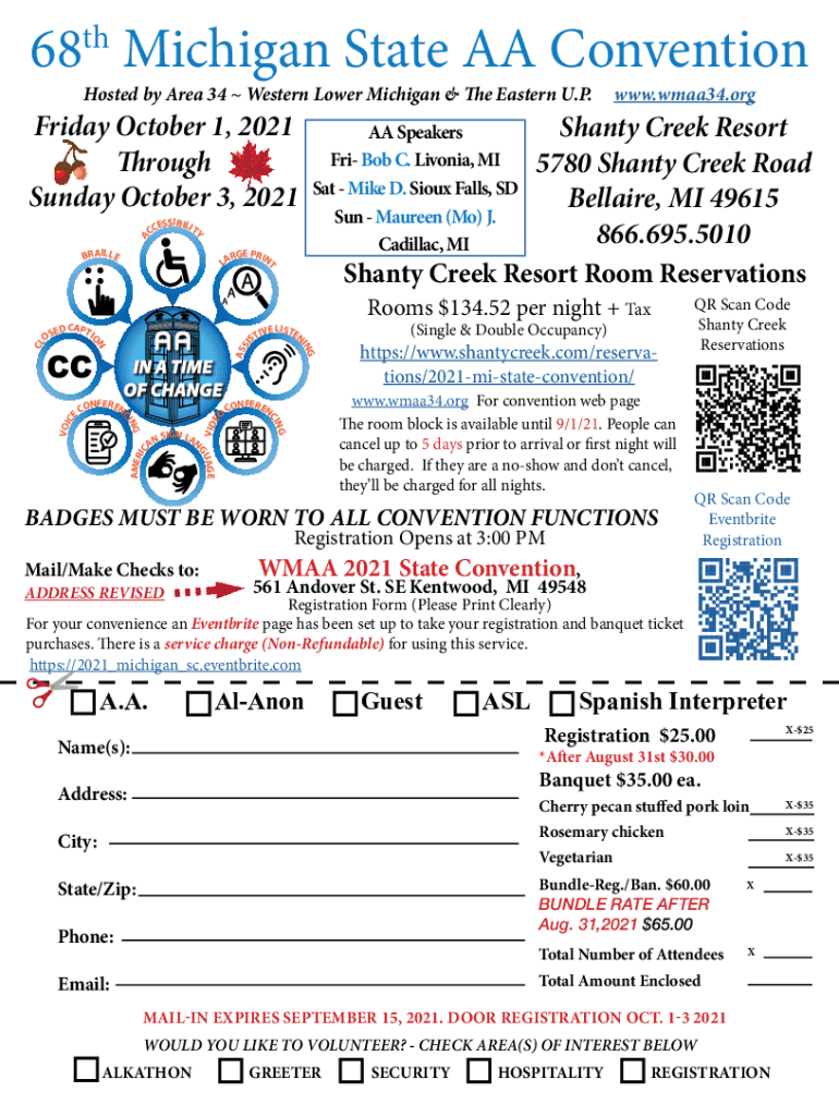68th Michigan State AA Convention Hosted by Area 34 Western Lower Michigan & The Eastern U.P. Shanty Creek Resort 5780 Shanty Creek Road Bella ire, MI 49615 866.695.5010 Shanty Creek Resort Room Reservations