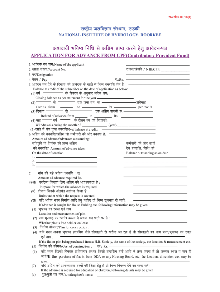 V/NIH/18(I) NATIONAL INSTITUTE OF HYDROLOGY, ROOKIE ! \”#$ %$& #\' APPLICATION FOR ADVANCE FROM CPF(Contributory Provident Fund) 1. +be x/Name of the applicant V/+x / NIH/CPF: ___ 2. Hi J/Account