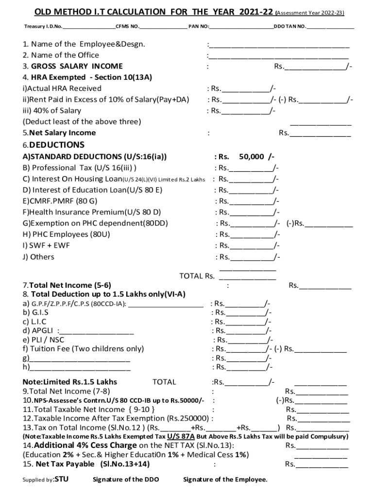 OLD METHOD I. T CALCULATION FOR THE YEAR 202122 (Assessment Year 202223) Treasury I.D. No.___CFS NO.___ PAN NO:___DDO TAN NO.___1. Name of the Employee&Desgn. ___ 2. Name of the Office :___ 3. GROSS