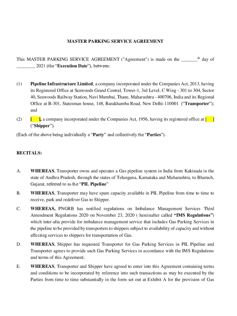 MASTER PARKING SERVICE Agreements MASTER PARKING SERVICE AGREEMENT (\” Agreement\”) is made on the ___TH day of
