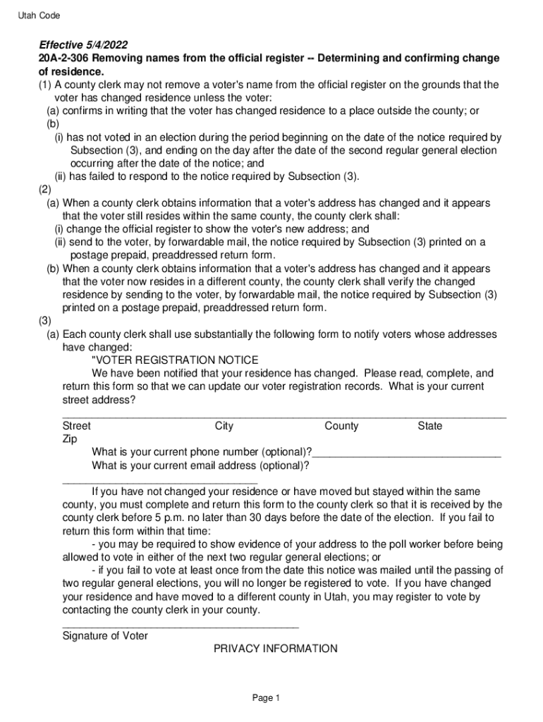Utah Noneffective 5/4/2022 20A2306 Removing names from the official register Determining and confirming change of residence. (1) A county clerk may not remove a voter\'s name from the official register
