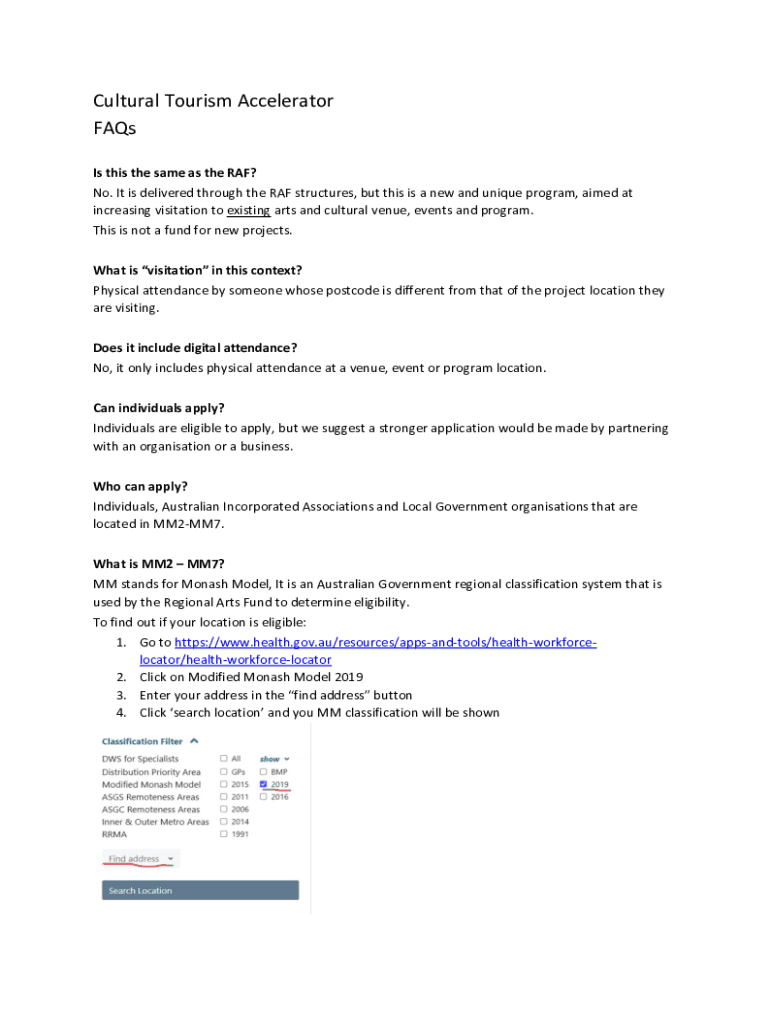 Cultural Tourism Accelerator FAQs Is this the same as the RAF? No. It is delivered through the RAF structures, but this is a new and unique program, aimed at increasing visitation to existing arts