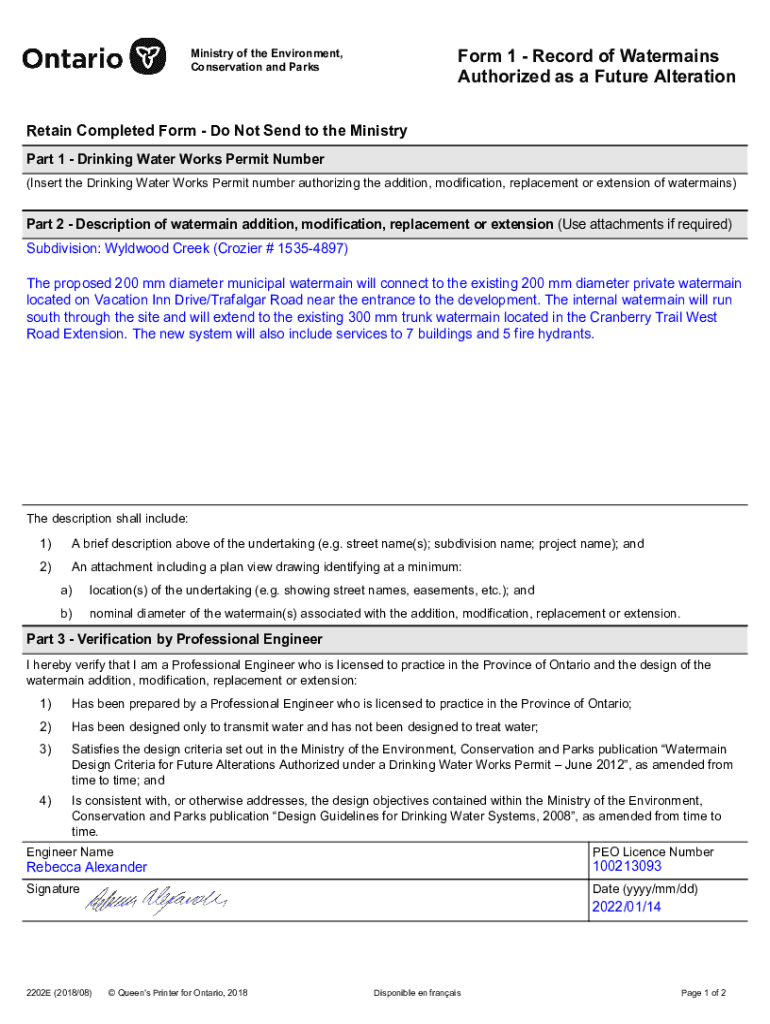 Form 1 Record of Water mains Authorized as a Future AlterationMinistry of the Environment, Conservation and ParksRetain Completed Form Do Not Send to the Ministry Part 1 Drinking Water Works Permit