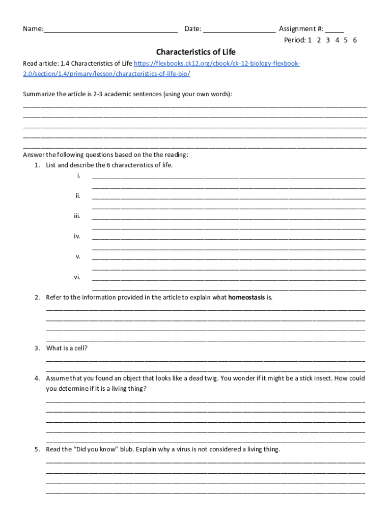 Name:___ Date: ___ Assignment #: ___ Period: 1 2 3 4 5 6Characteristics of Life Read article: 1.4 Characteristics of Life https://flexbooks.ck12.org/cbook/ck12biologyflexbook2.0/section/1.4/primary/lesson/characteristicsoflifebio/