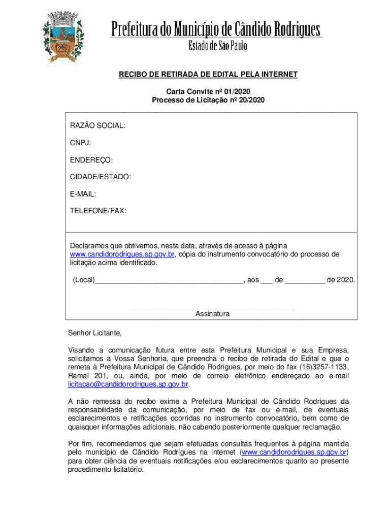 Get the free recibo de retirada de edital pela internet - Prefeitura Almas