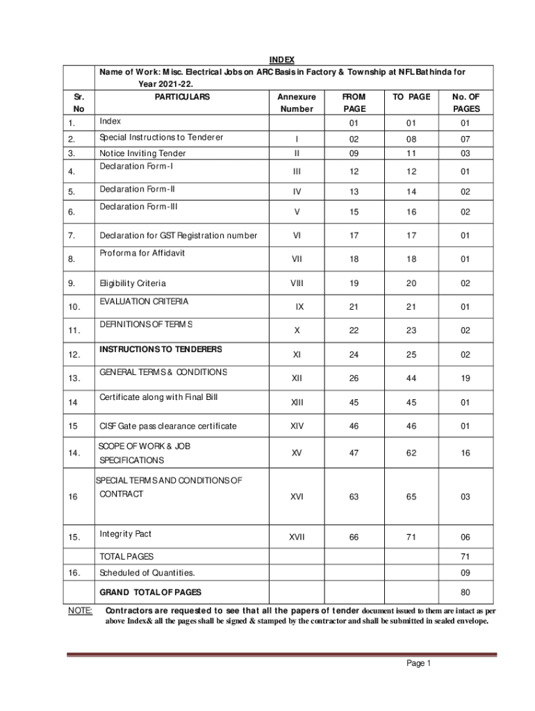 Sr. No 1. 2. 3. 4. 5. 6. 7. 8. 9. 10. 11. 12. 13. 14INDEX Name of Work: Misc. Electrical Jobs on ARC Basis in Factory & Township at NFL Bathing for Year 202122. PARTICULARS Appendix FROM TO PAGE No.